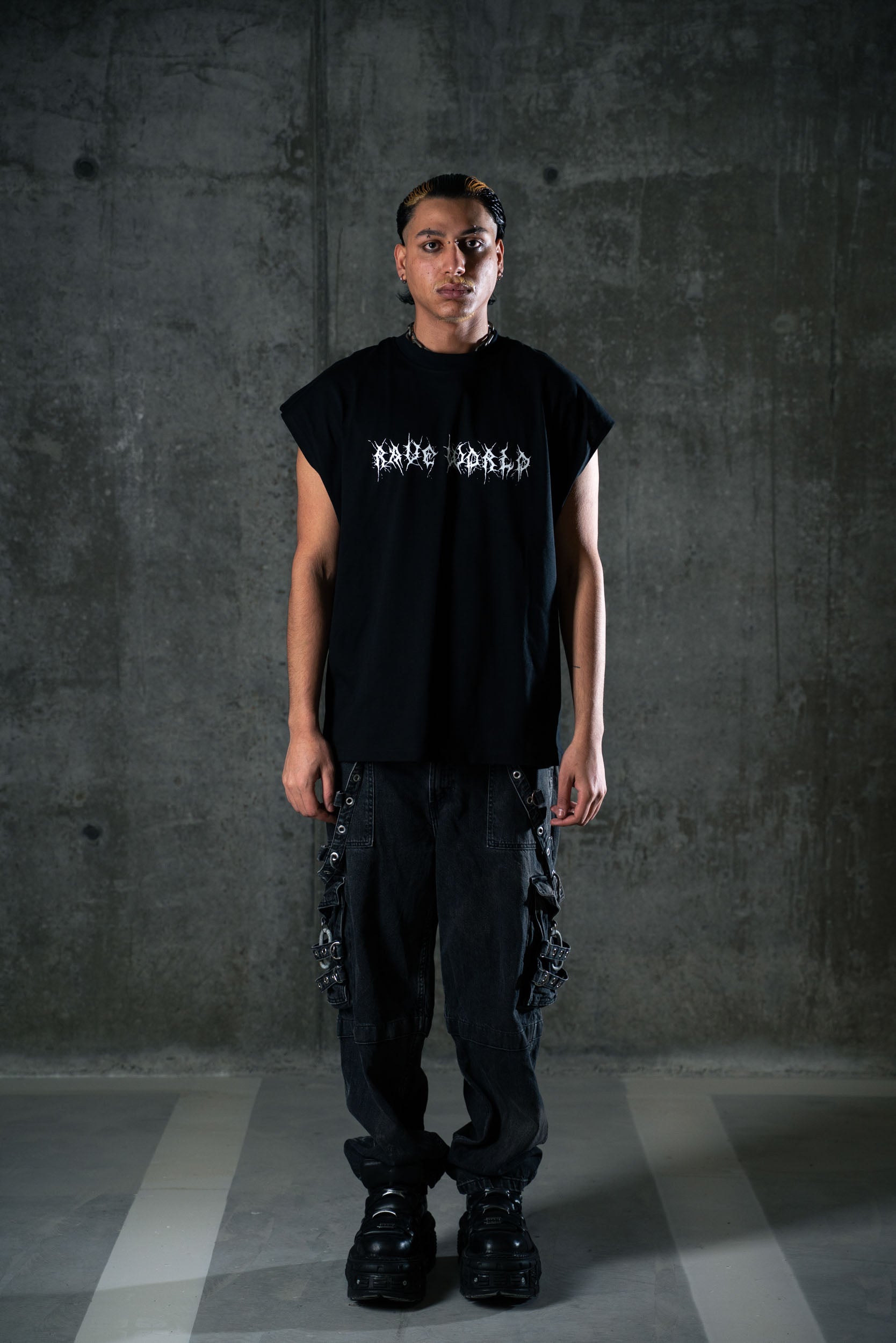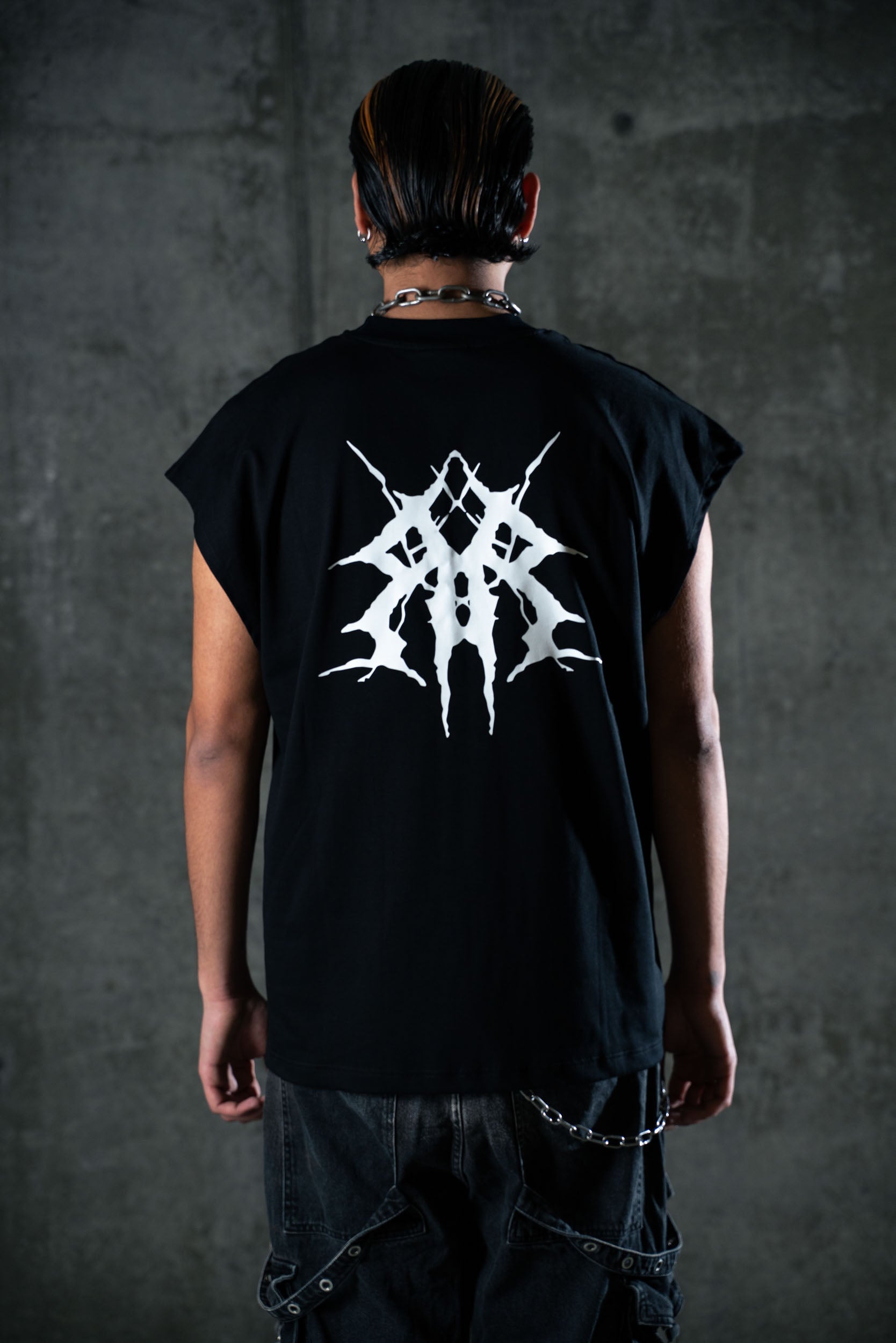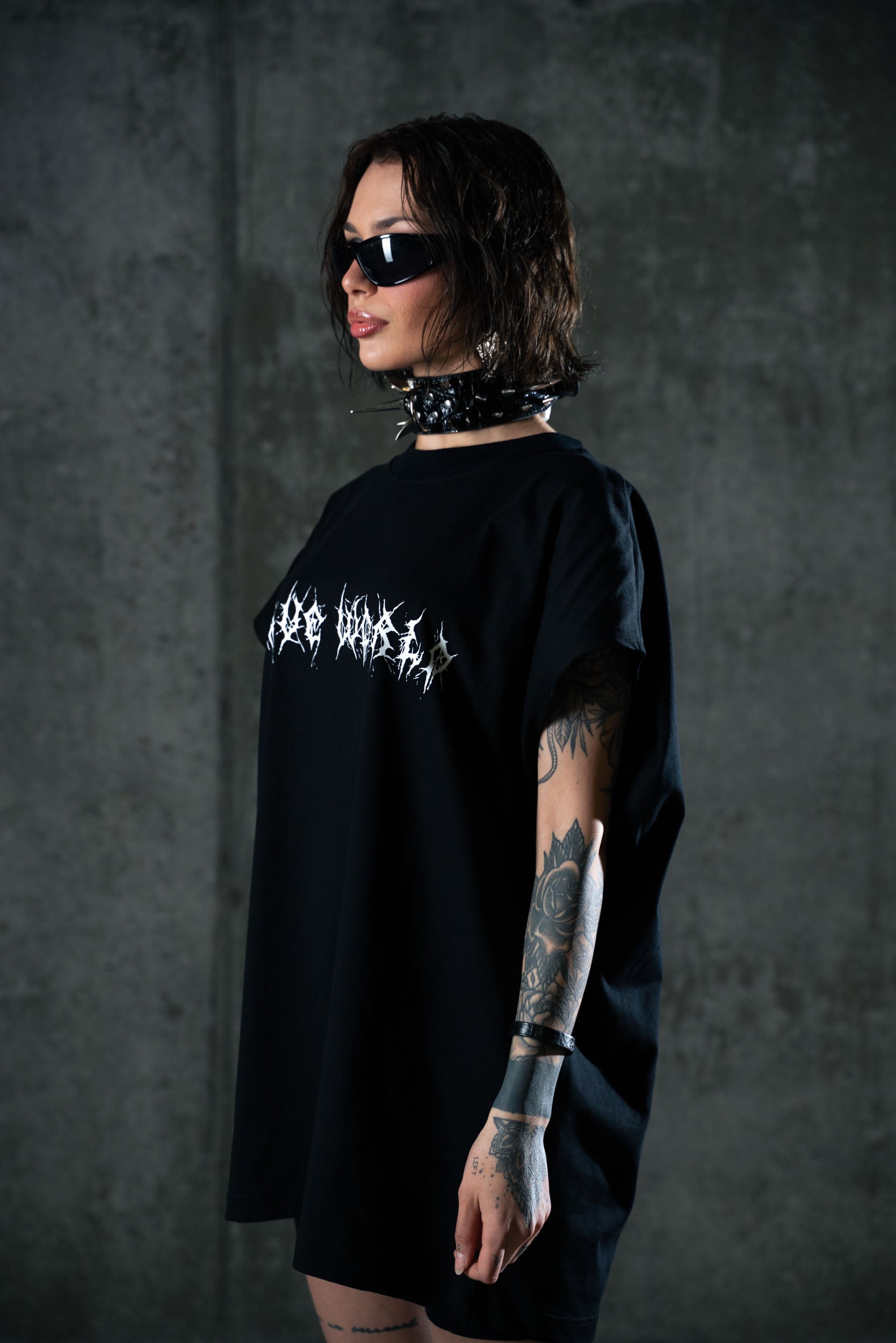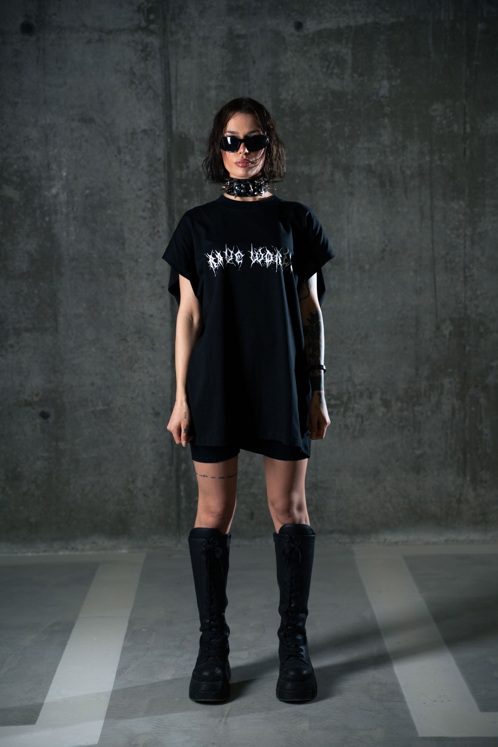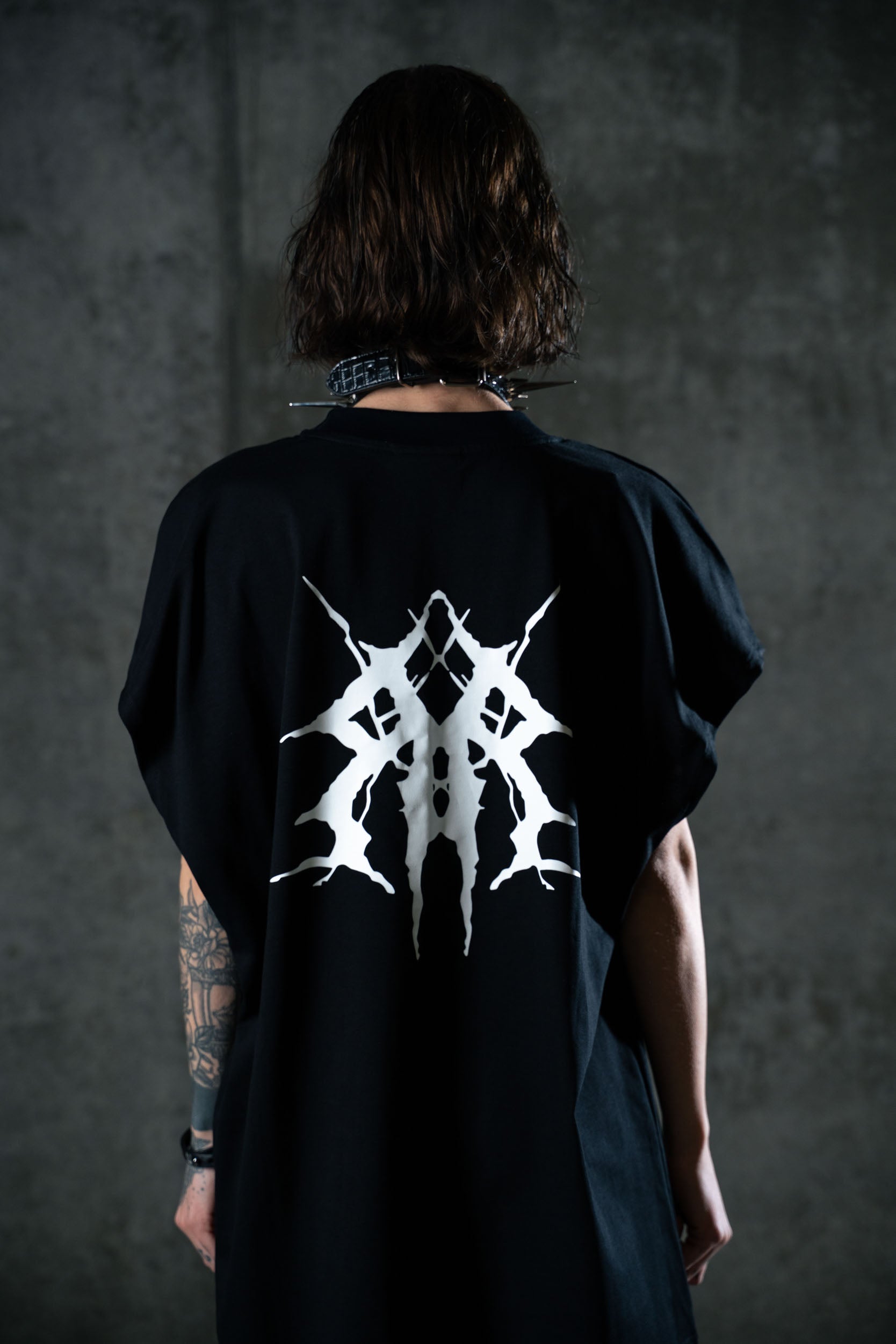 Realizzata in cotone premium 260gsm, presenta una silhouette oversize con spalle larghe e manica rifinita per un look solido e strutturato. Il logo frontale in stile tribal-metal si fonde con l'estetica industriale del brand, mentre sul retro domina una stampa iperrealistica di un’entità digitale: simbolo della nuova era rave.