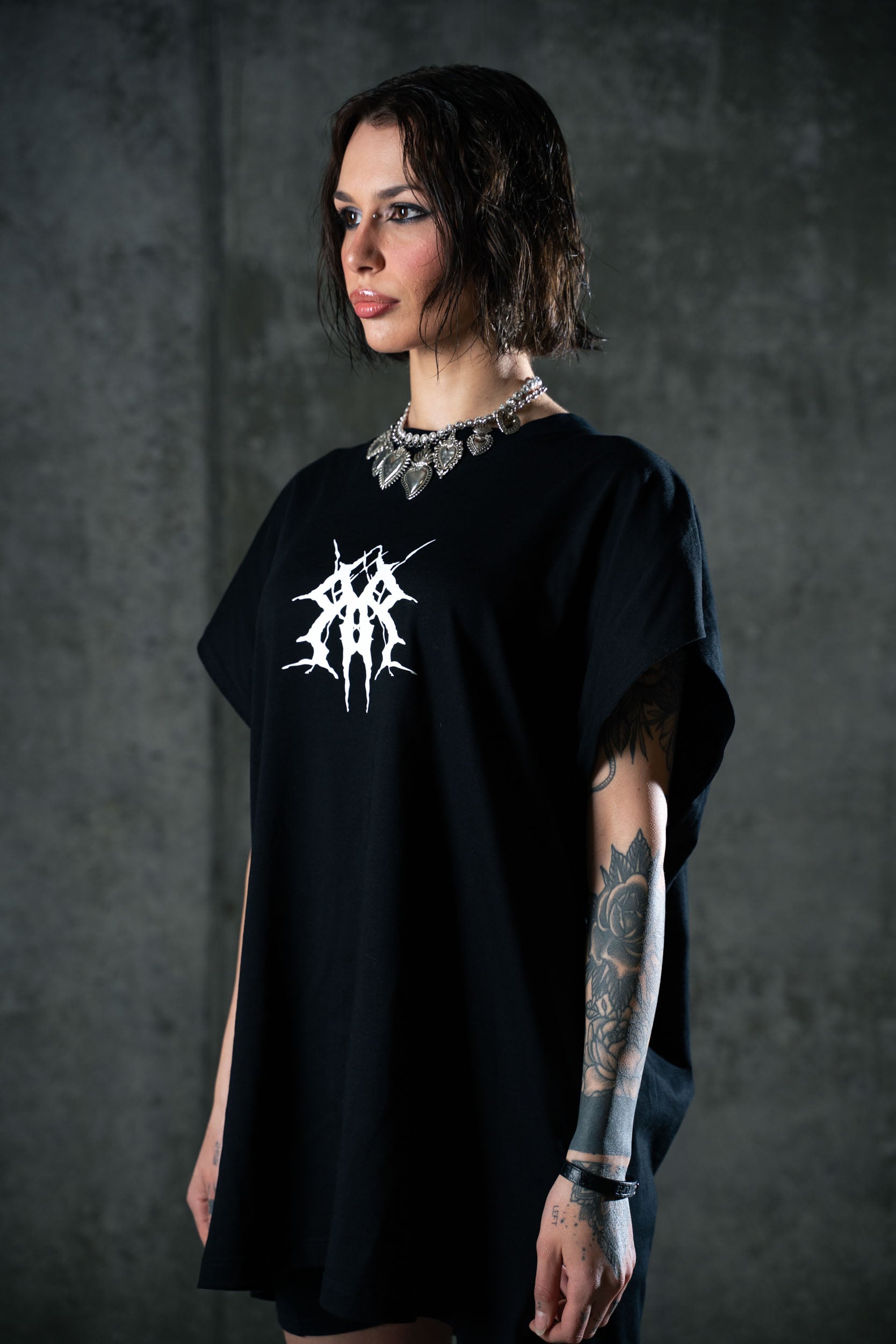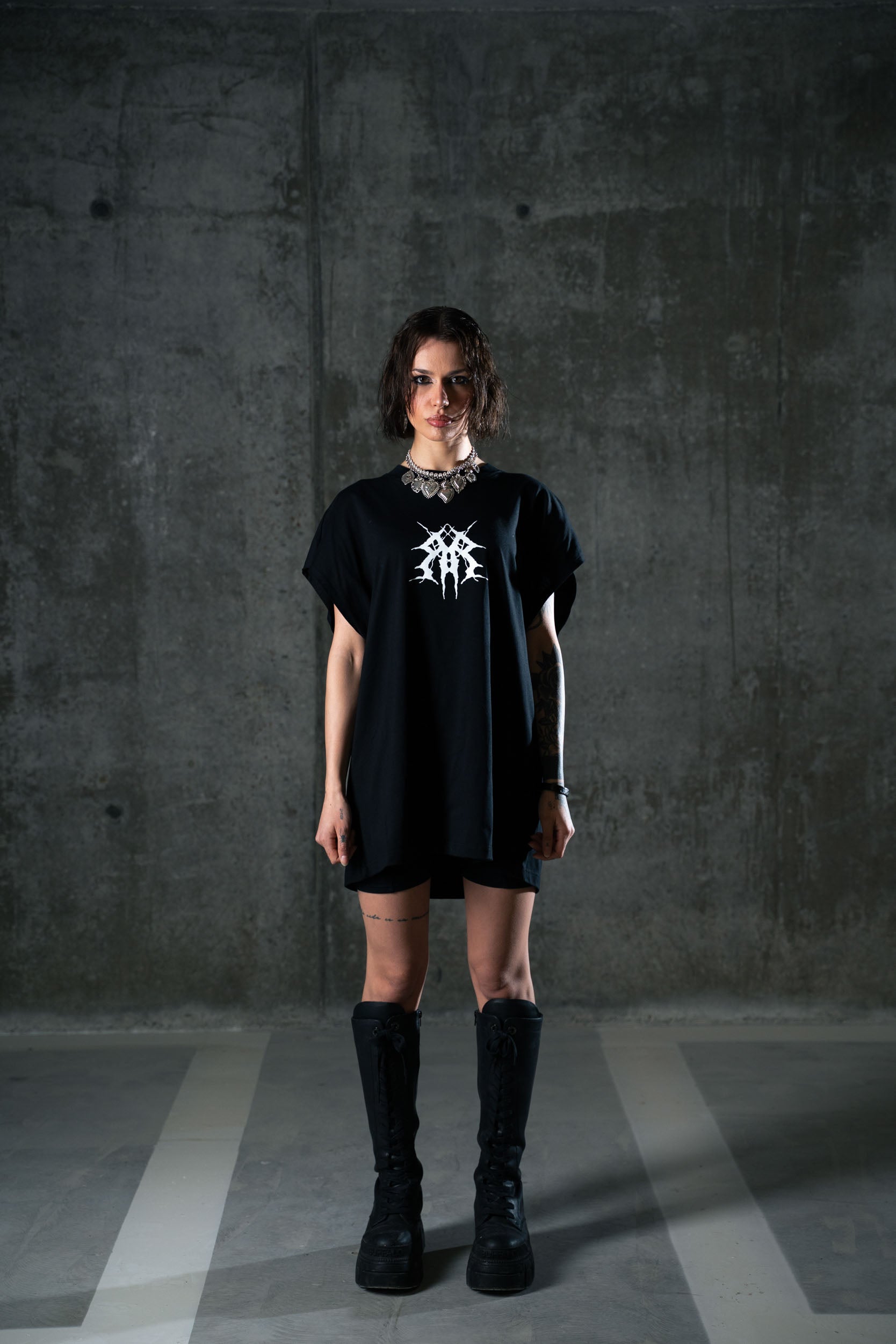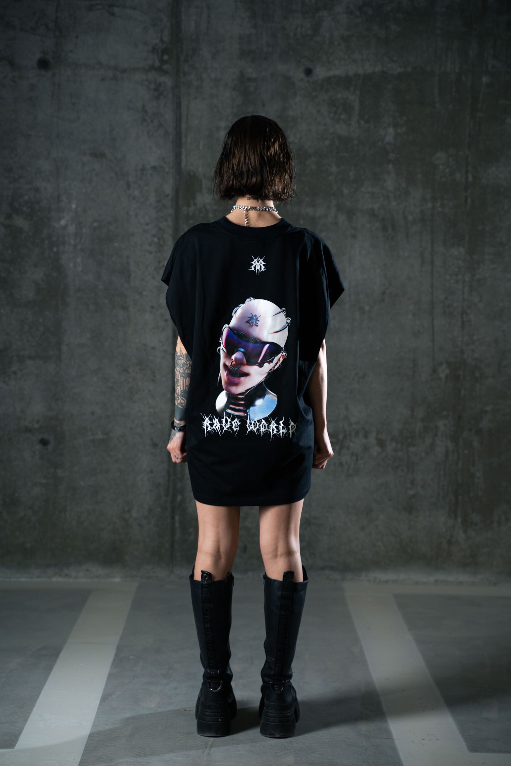 Realizzata in cotone premium 260gsm, presenta una silhouette oversize con spalle larghe e manica rifinita per un look solido e strutturato. Il logo frontale in stile tribal-metal si fonde con l'estetica industriale del brand, mentre sul retro domina una stampa iperrealistica di un’entità digitale: simbolo della nuova era rave.
