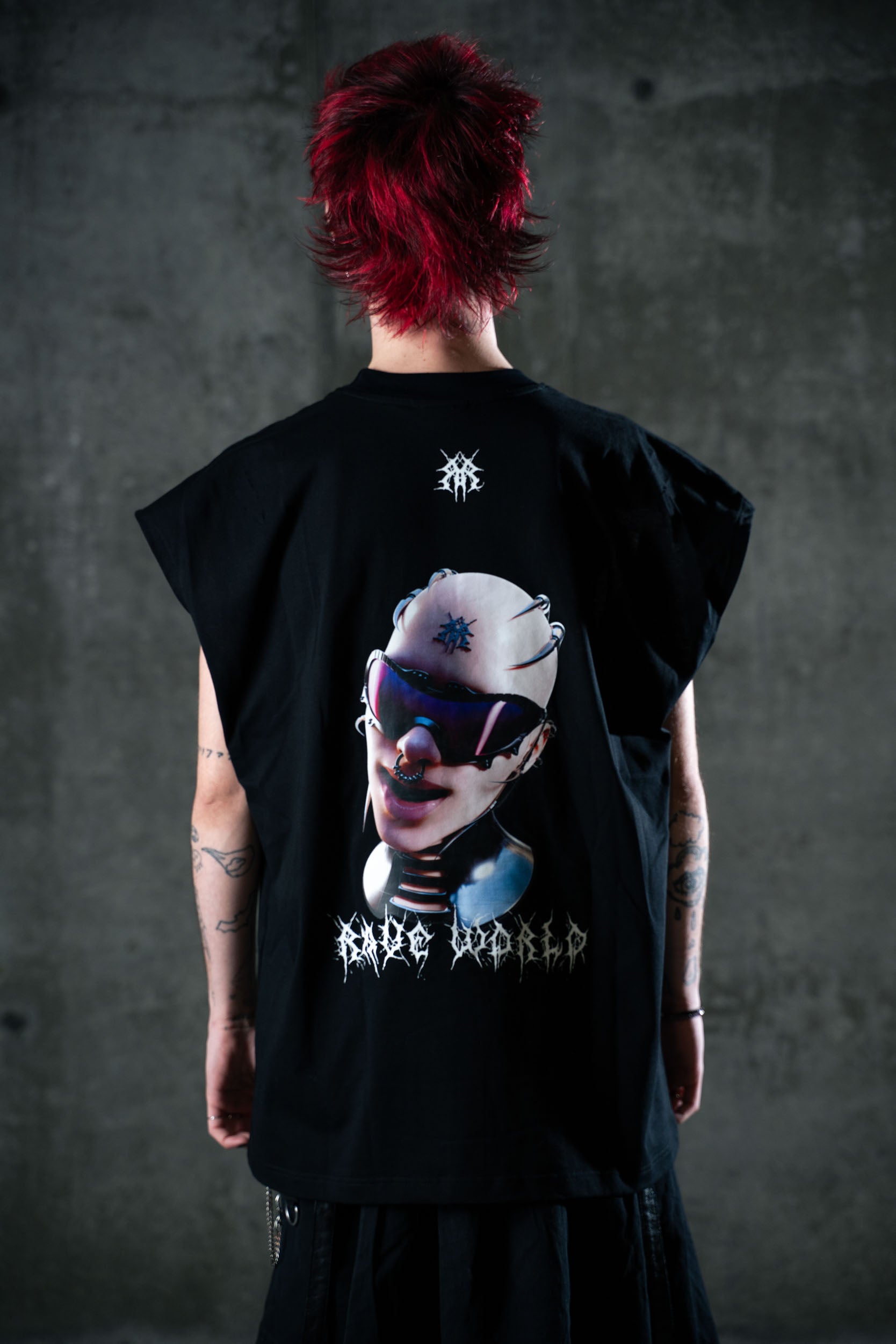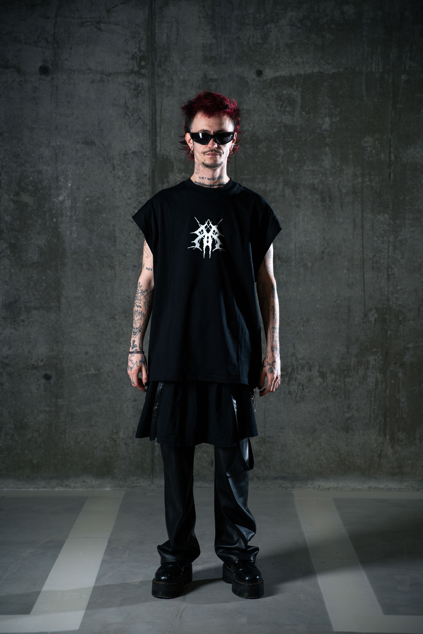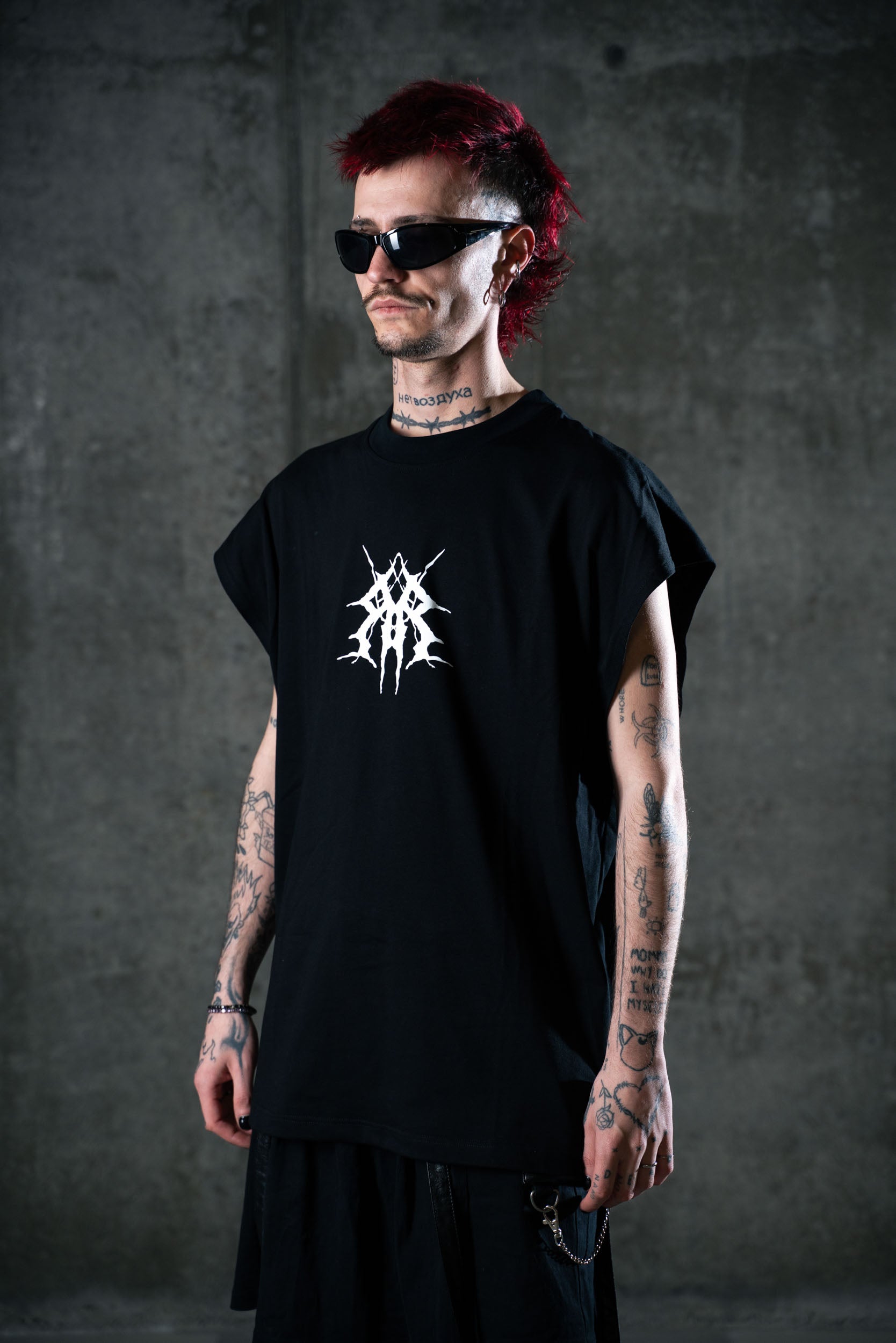 Realizzata in cotone premium 260gsm, presenta una silhouette oversize con spalle larghe e manica rifinita per un look solido e strutturato. Il logo frontale in stile tribal-metal si fonde con l'estetica industriale del brand, mentre sul retro domina una stampa iperrealistica di un’entità digitale: simbolo della nuova era rave.