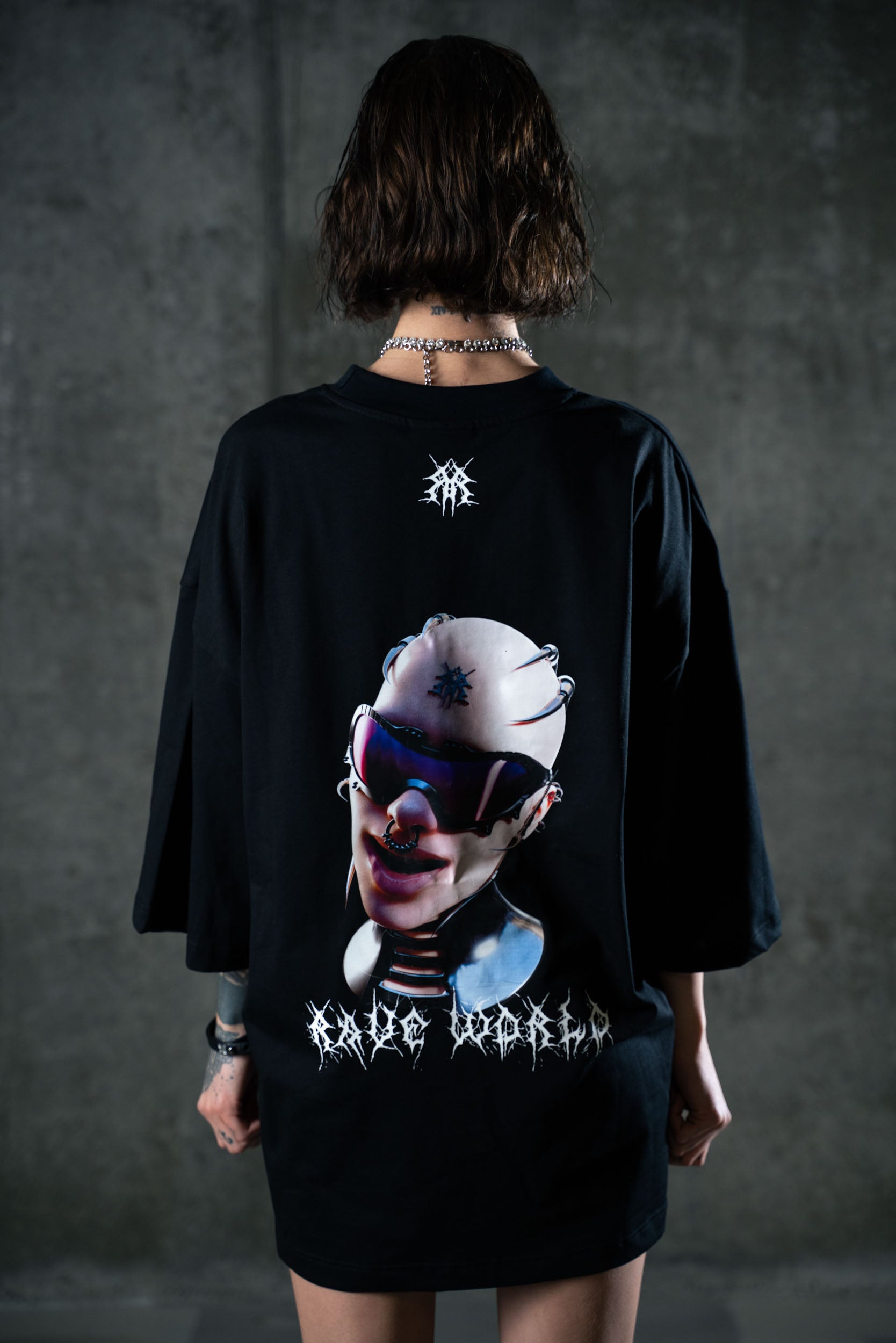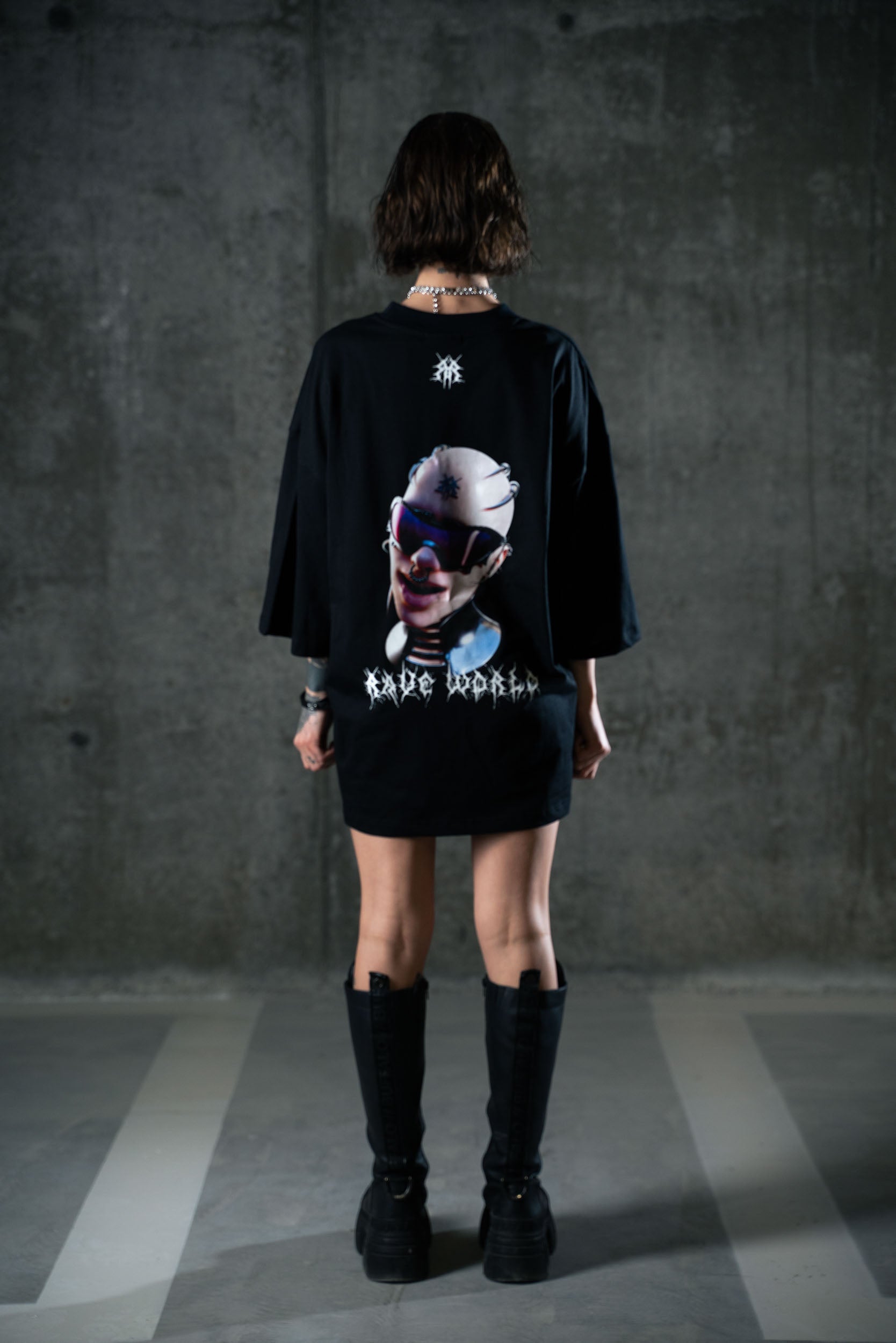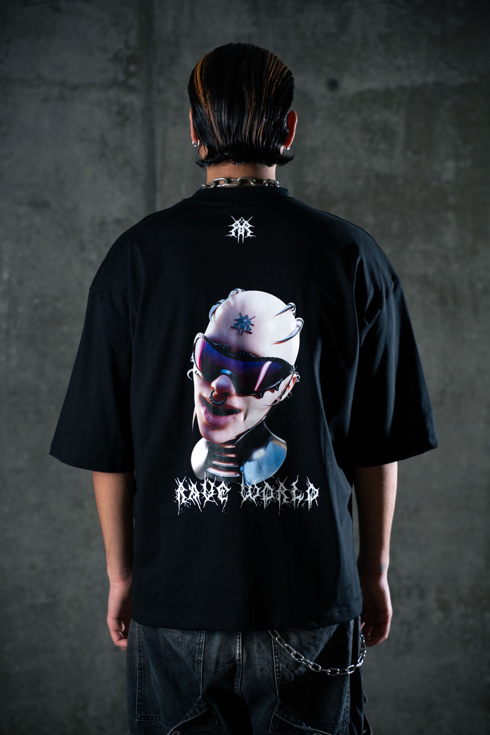 Realizzata in cotone premium 260gsm, questa tee presenta un fit ampio e strutturato con maniche larghe e rifinite. Sul petto, il logo tribal-tech del brand richiama simboli digitali e underground. Sul retro, una stampa iperrealistica raffigura l'entità cyber-raver: figura chiave del nostro mondo post-umano.