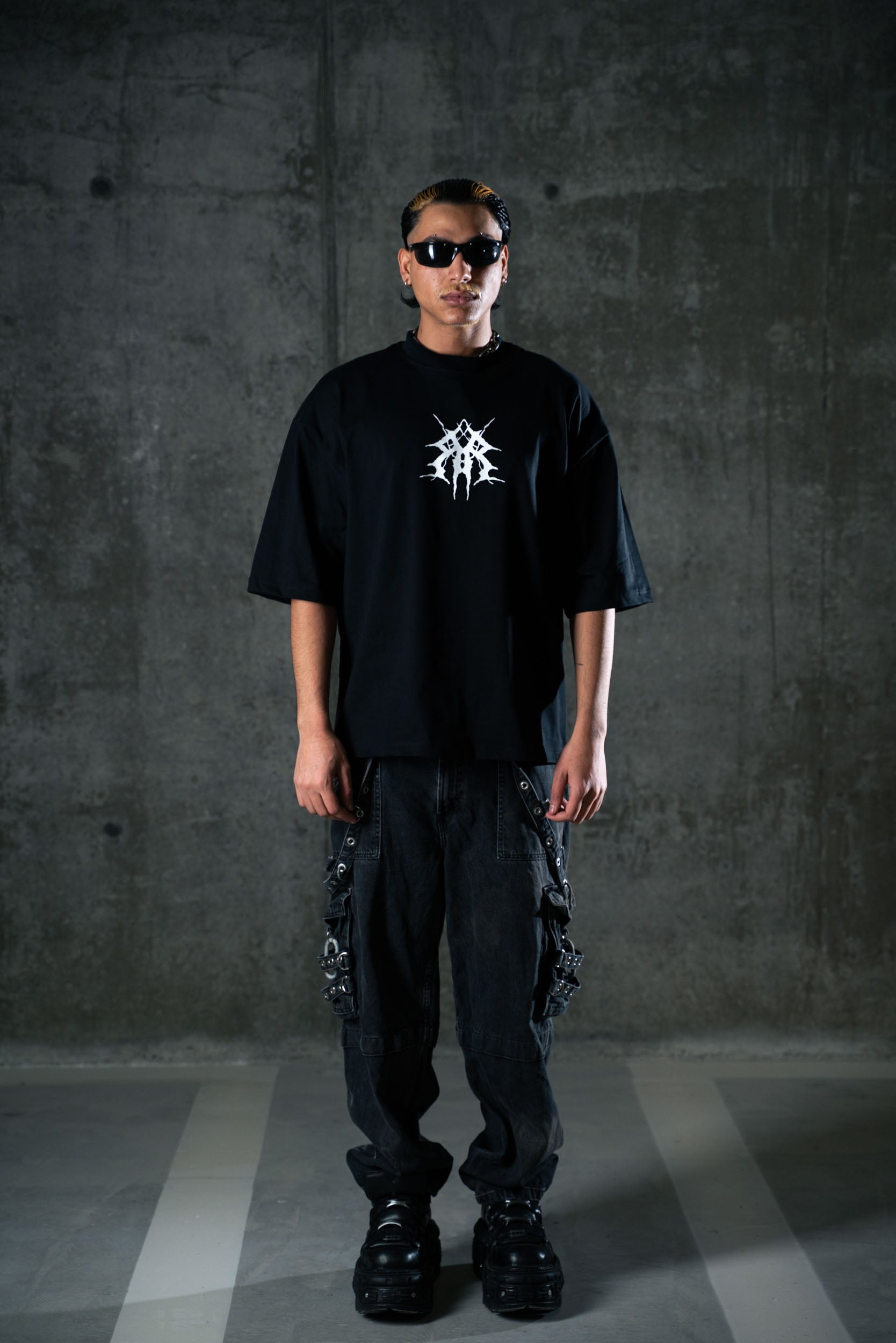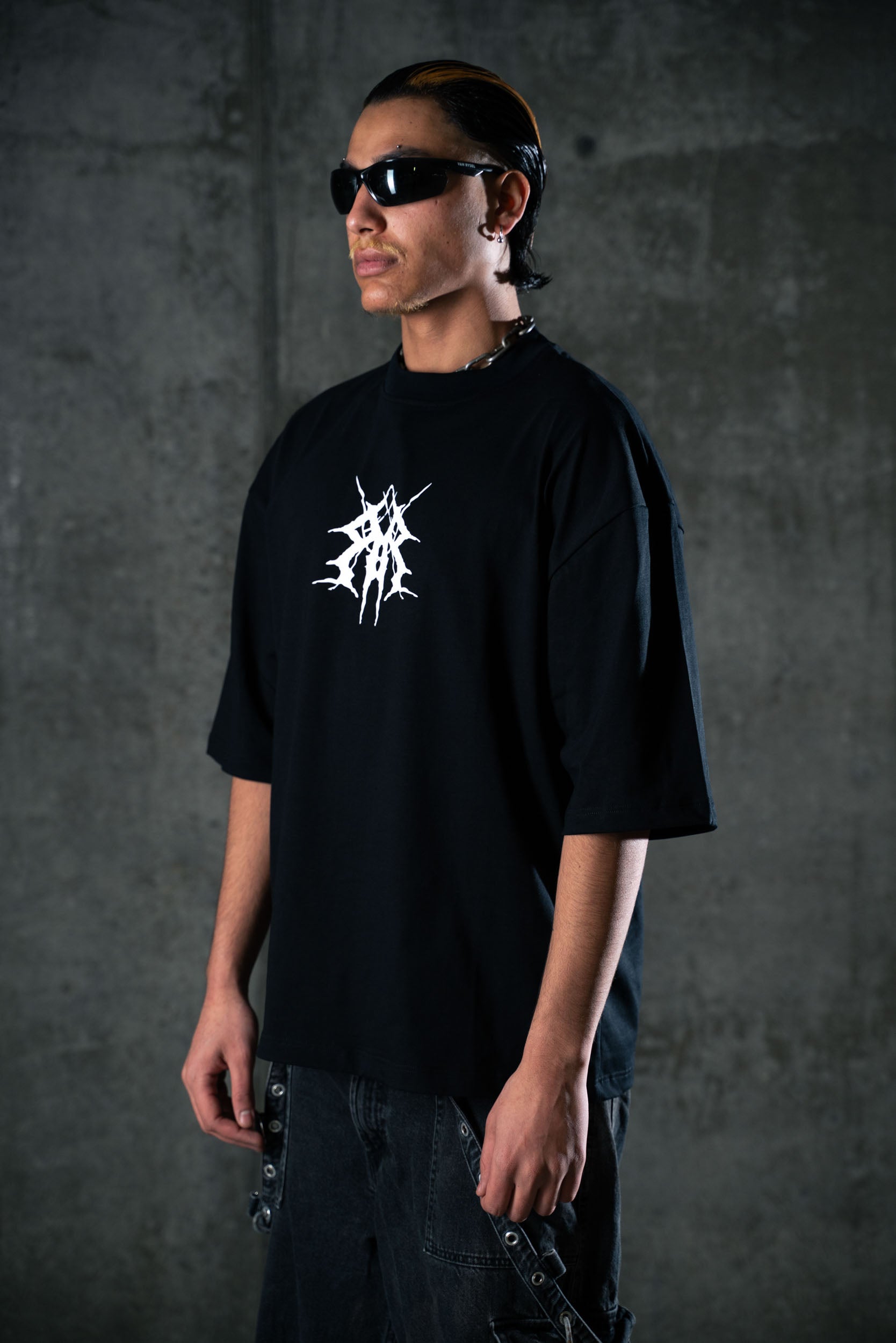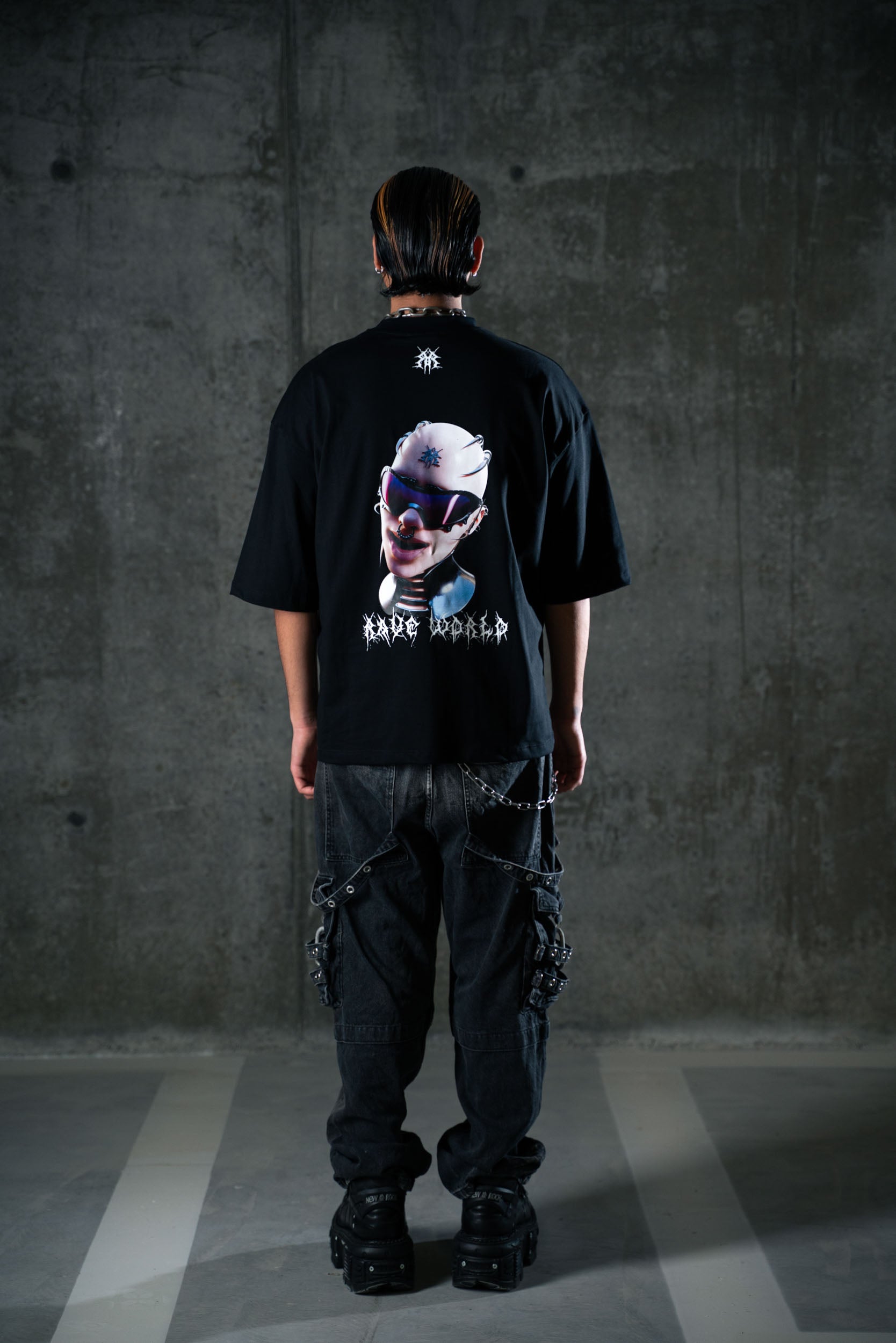 Realizzata in cotone premium 260gsm, questa tee presenta un fit ampio e strutturato con maniche larghe e rifinite. Sul petto, il logo tribal-tech del brand richiama simboli digitali e underground. Sul retro, una stampa iperrealistica raffigura l'entità cyber-raver: figura chiave del nostro mondo post-umano.