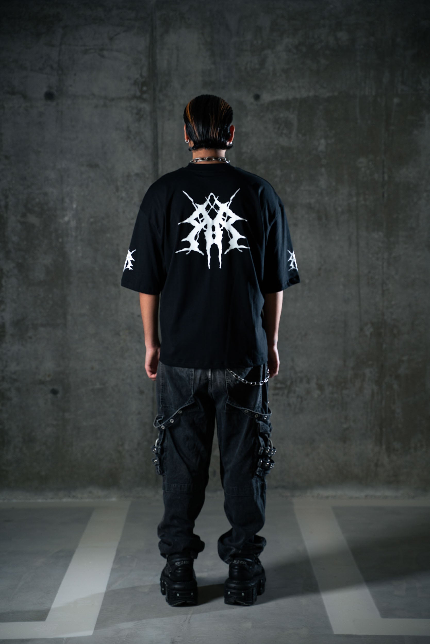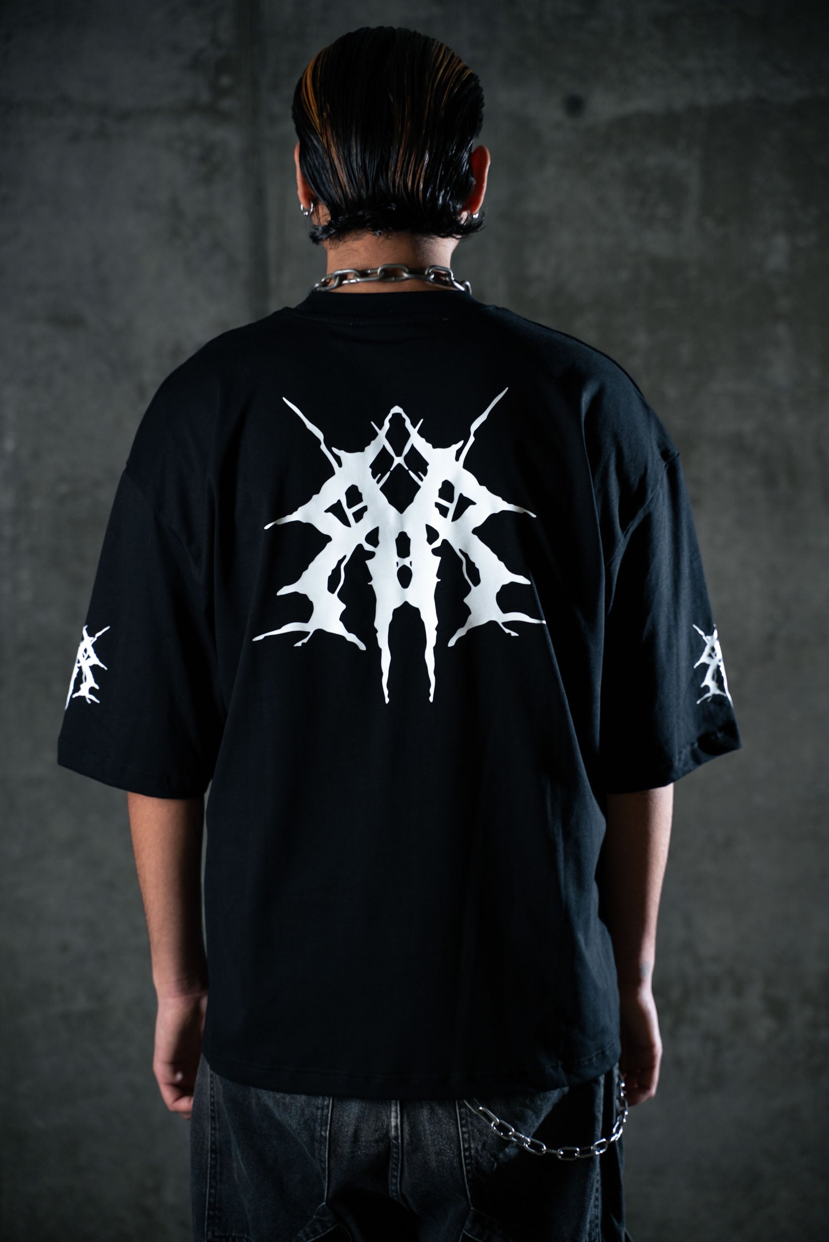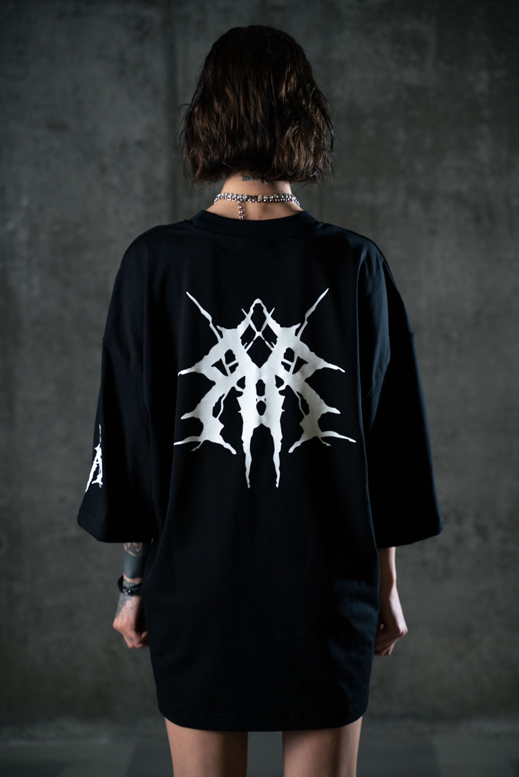 Realizzata in cotone premium 260gsm, questa tee presenta un fit ampio e strutturato con maniche larghe e rifinite. Sul petto, il logo tribal-tech del brand richiama simboli digitali e underground. Sul retro, una stampa iperrealistica raffigura l'entità cyber-raver: figura chiave del nostro mondo post-umano.