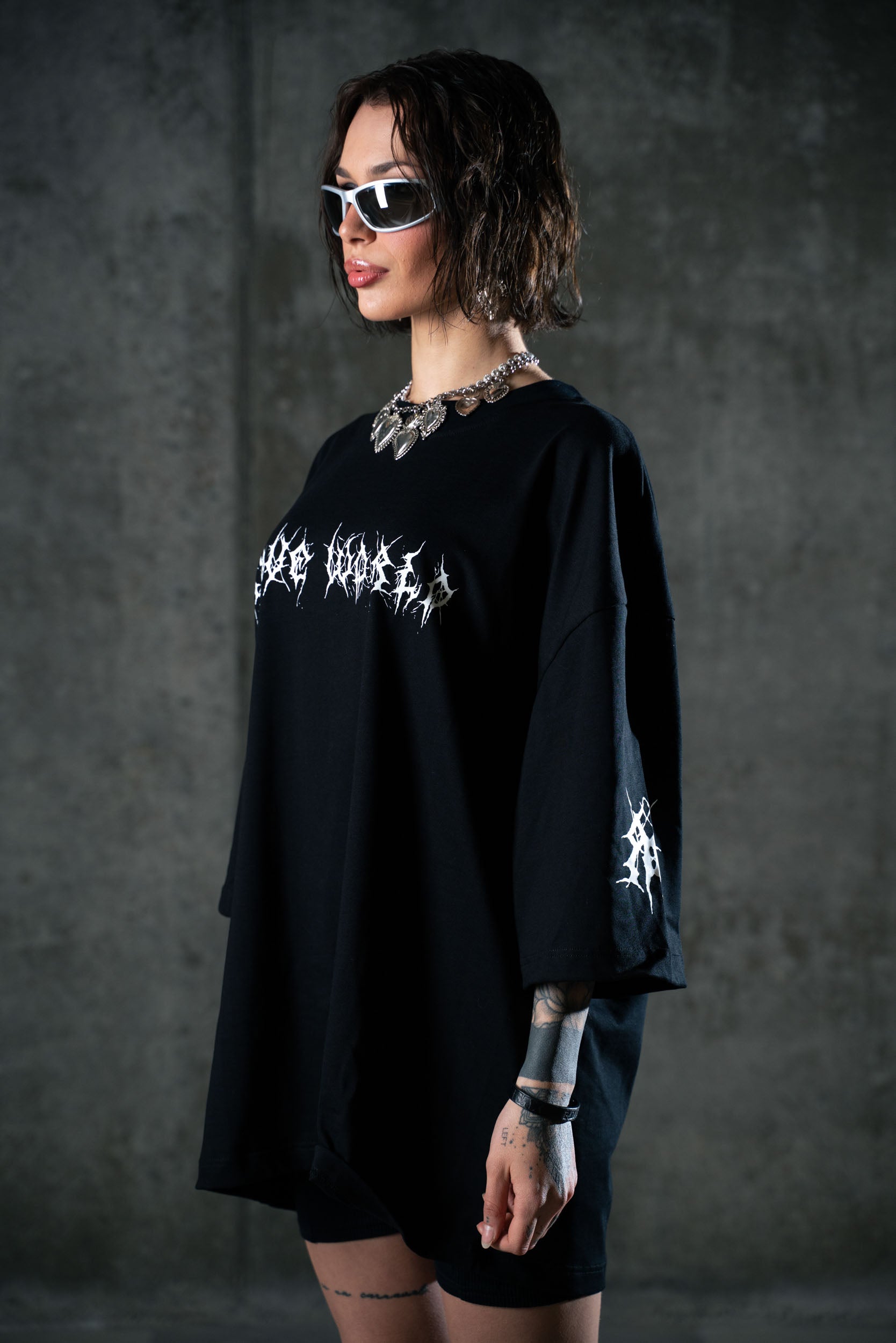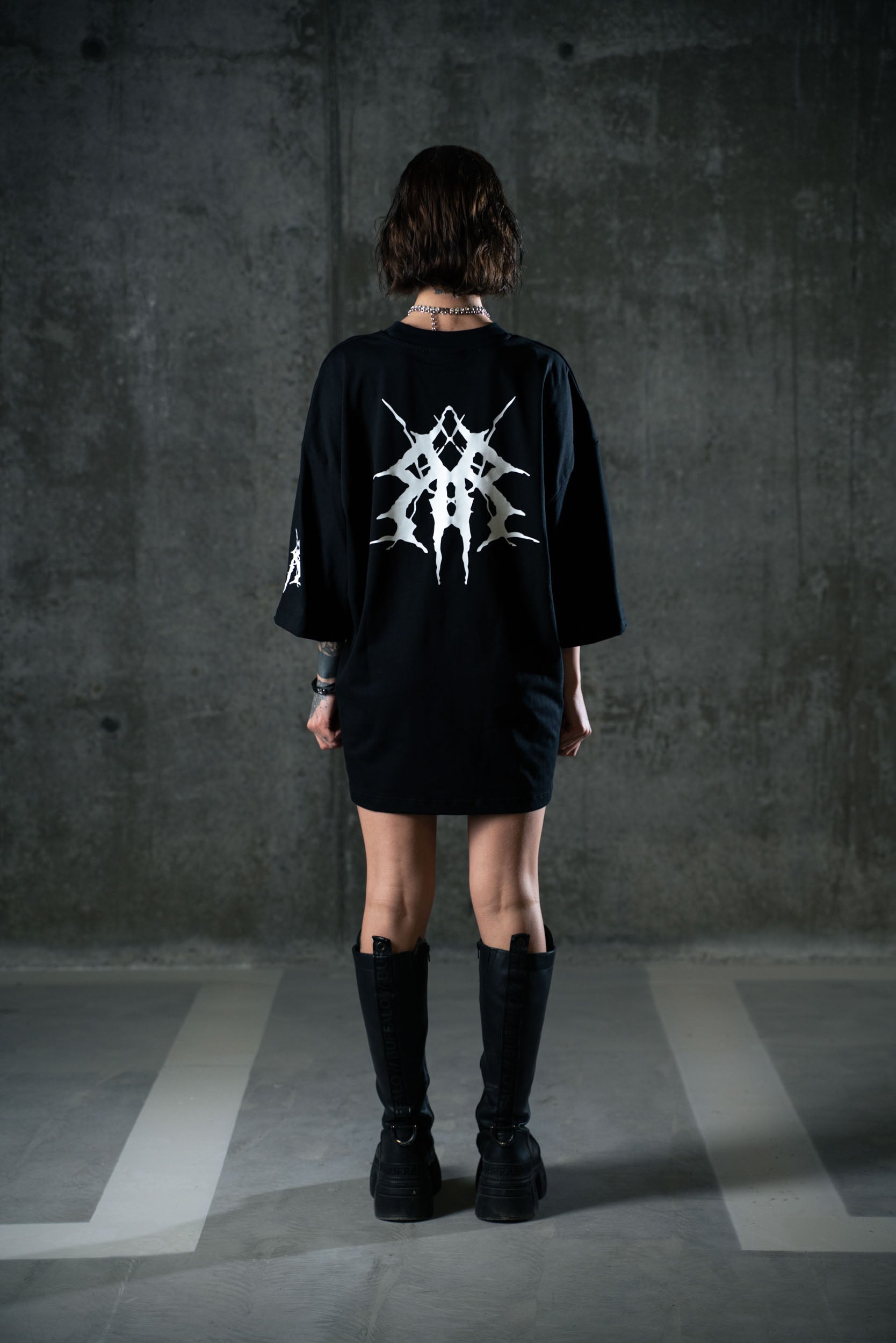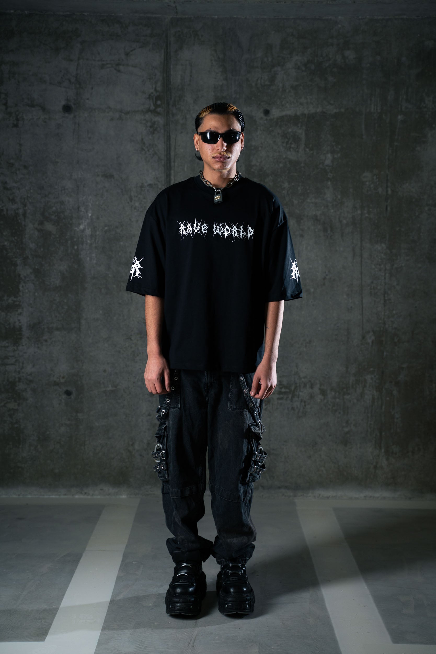 Realizzata in cotone premium 260gsm, questa tee presenta un fit ampio e strutturato con maniche larghe e rifinite. Sul petto, il logo tribal-tech del brand richiama simboli digitali e underground. Sul retro, una stampa iperrealistica raffigura l'entità cyber-raver: figura chiave del nostro mondo post-umano.